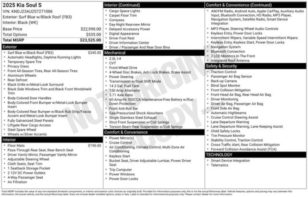 Visit our Website for a Complimentary CarFax Report!!!, Free First Oil Change, Auto Reward Program, 4-Wheel Disc Brakes, 6 Speakers, 6.5J x 16" Alloy Wheels, ABS brakes, Air Conditioning, Alloy wheels, AM/FM radio: SiriusXM, Apple CarPlay & Android Auto, Auto High-beam Headlights, Automatic temperature control, Brake assist, Bumpers: body-color, Carpeted Floor Mats, Compass, Delay-off headlights, Driver door bin, Driver vanity mirror, Dual front impact airbags, Dual front side impact airbags, Electronic Stability Control, Emergency communication system, Exterior Parking Camera Rear, Front anti-roll bar, Front Bucket Seats, Front Center Armrest, Front dual zone A/C, Front reading lights, Front wheel independent suspension, Fully automatic headlights, Illuminated entry, Low tire pressure warning, Navigation System, Occupant sensing airbag, Outside temperature display, Overhead airbag, Overhead console, Panic alarm, Passenger door bin, Passenger vanity mirror, Power door mirrors, Power driver seat, Power steering, Power windows, Radio data system, Radio: AM/FM/MP3/HD Audio System, Rear window defroster, Rear window wiper, Remote keyless entry, Speed control, Speed-sensing steering, Split folding rear seat, Steering wheel mounted audio controls, Tachometer, Telescoping steering wheel, Tilt steering wheel, Traction control, Trip computer, Variably intermittent wipers, Woven & Tricot Cloth Seat Trim. 2025 Kia Soul S S 2.0L I4 DOHC FWD Surf Blue w/Black Roof Price includes: $500 - Kia Customer Cash. Exp. 11/03/2025
