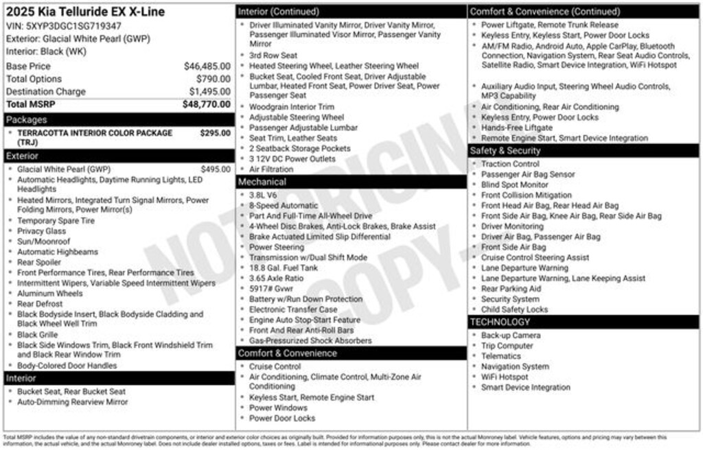 Visit our Website for a Complimentary CarFax Report!!!, Free First Oil Change, Auto Reward Program, 3rd row seats: split-bench, 4-Wheel Disc Brakes, 6 Speakers, ABS brakes, Air Conditioning, Alloy wheels, AM/FM radio: SiriusXM, Apple CarPlay & Android Auto, Auto High-beam Headlights, Auto-dimming Rear-View mirror, Auto-leveling suspension, Automatic temperature control, Brake assist, Bumpers: body-color, Compass, Delay-off headlights, Driver door bin, Driver vanity mirror, Dual front impact airbags, Dual front side impact airbags, Electronic Stability Control, Emergency communication system: 911 Connect, Exterior Parking Camera Rear, Four wheel independent suspension, Front anti-roll bar, Front Bucket Seats, Front Center Armrest, Front dual zone A/C, Front reading lights, Fully automatic headlights, Heated & Ventilated Front Bucket Seats, Heated door mirrors, Heated front seats, Heated steering wheel, Illuminated entry, Knee airbag, Leather Seat Trim, Leather Shift Knob, Leather steering wheel, Low tire pressure warning, Navigation System, Occupant sensing airbag, Outside temperature display, Overhead airbag, Overhead console, Panic alarm, Passenger door bin, Passenger vanity mirror, Power door mirrors, Power driver seat, Power Liftgate, Power moonroof, Power passenger seat, Power steering, Power windows, Radio data system, Radio: AM/FM Display Audio System, Rear air conditioning, Rear anti-roll bar, Rear audio controls, Rear reading lights, Rear side impact airbag, Rear window defroster, Rear window wiper, Reclining 3rd row seat, Remote keyless entry, Security system, Speed control, Speed-sensing steering, Split folding rear seat, Spoiler, Steering wheel mounted audio controls, Tachometer, Telescoping steering wheel, Terracotta Interior Color Package, Tilt steering wheel, Traction control, Trip computer, Turn signal indicator mirrors, Variably intermittent wipers, Ventilated front seats, Wheels: 20" x 7.5" Black Finish X-LINE Exclusive. 2025 Kia Telluride EX X-Line EX X-Line 3.8L V6 DOHC AWD Glacial White Pearl Price includes: $2000 - KFA Dealer Choice Program: $2000 discount and 5.25% APR for 36 months. $30.08 per $1000 financed. Available to well qualified buyers who finance through Kia Finance America. 506. Exp. 12/01/2025