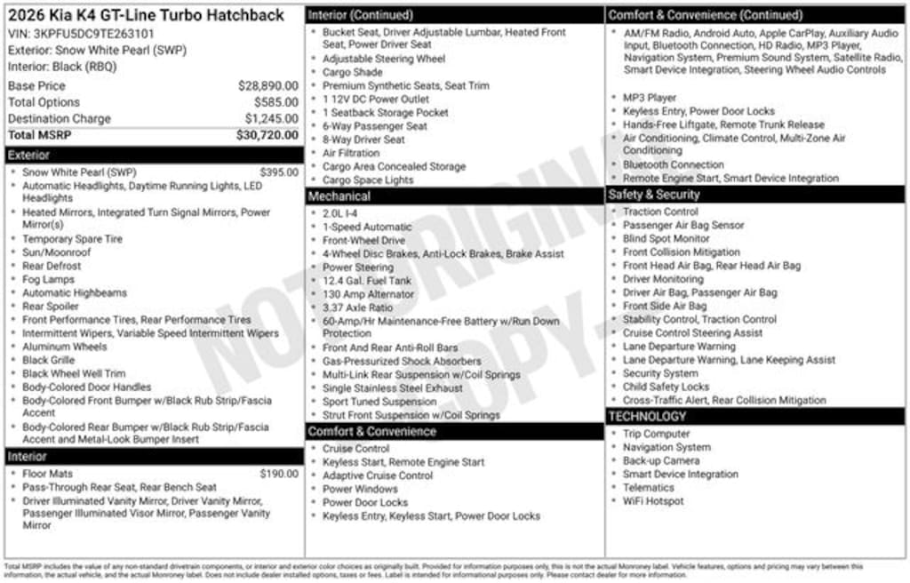 Visit our Website for a Complimentary CarFax Report!!!, Auto Reward Program, 4-Wheel Disc Brakes, 8 Speakers, ABS brakes, Air Conditioning, Alloy wheels, AM/FM radio: SiriusXM, Apple CarPlay & Android Auto, Auto High-beam Headlights, Automatic temperature control, Brake assist, Bumpers: body-color, Carpeted Floor Mats, Delay-off headlights, Driver door bin, Driver vanity mirror, Dual front impact airbags, Dual front side impact airbags, Electronic Stability Control, Emergency communication system: 911 Connect, Four wheel independent suspension, Front anti-roll bar, Front Bucket Seats, Front Center Armrest, Front dual zone A/C, Front fog lights, Front Heated Bucket Seats, Front reading lights, Fully automatic headlights, harman/kardon® Speakers, Heated door mirrors, Heated front seats, Illuminated entry, Low tire pressure warning, Navigation System, Occupant sensing airbag, Outside temperature display, Overhead airbag, Overhead console, Panic alarm, Passenger door bin, Passenger vanity mirror, Power door mirrors, Power driver seat, Power moonroof, Power steering, Power windows, Radio data system, Radio: 12.3" Touchscreen Audio Display, Rear anti-roll bar, Rear seat center armrest, Rear side impact airbag, Rear window defroster, Rear window wiper, Remote keyless entry, Security system, Speed control, Split folding rear seat, Spoiler, Sport steering wheel, Steering wheel mounted audio controls, SynTex Artificial Leather Seat Trim, Tachometer, Telescoping steering wheel, Tilt steering wheel, Traction control, Trip computer, Turn signal indicator mirrors, Variably intermittent wipers, Wheels: 18" x 8.0J Black Alloy. 2026 Kia K4 GT-Line Turbo GT-Line Turbo 1.6L I4 DGI 16V FWD Snow White Pearl Price includes: $600 - KFA Dealer Choice Program: $600 discount and 5.25% APR for 36 months. $30.08 per $1000 financed. Available to well qualified buyers who finance through Kia Finance America. 506. Exp. 03/02/2026